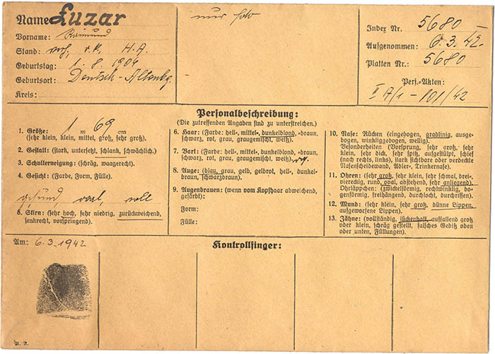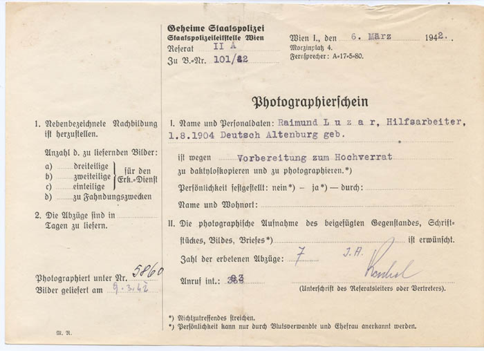 Der Hilfsarbeiter Raimund Luzar gehörte der kommunistischen Widerstandsgruppe in Hainburg a. d. Donau (NÖ) an. Er wurde am 6. 3. 1942 von der Gestapo erkennungsdienstlich erfasst und am 12. 3. 1943 vom Volksgerichtshof wegen "Vorbereitung zum Hochverrat" zu 5 Jahren Zuchthaus verurteilt. Raimund Luzar befand sich bis 9. 5. 1945 in Haft.
