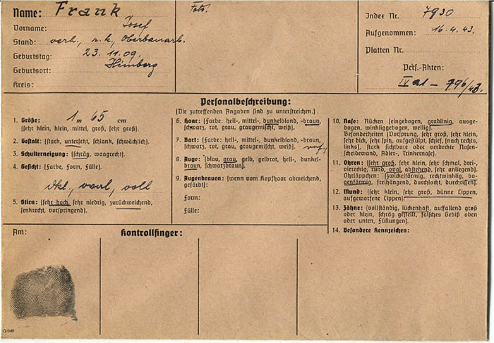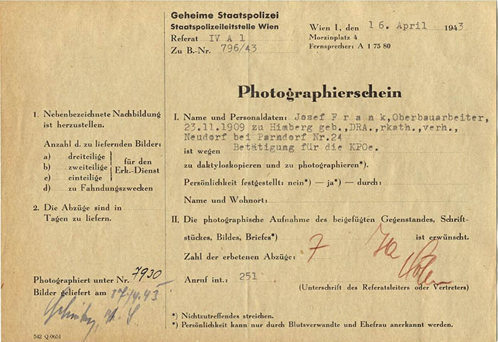 Der Bahnarbeiter Josef Frank wurde wegen kommunistischer Betätigung am 16. 4. 1943 von der Gestapo Wien erkennungsdienstlich erfasst. Er wurde am 14. 12. 1943 vom Oberlandesgericht Wien wegen "Vorbereitung zum Hochverrat" zu 2 Jahren Zuchthaus verurteilt und blieb bis Mai 1945 in Haft.
