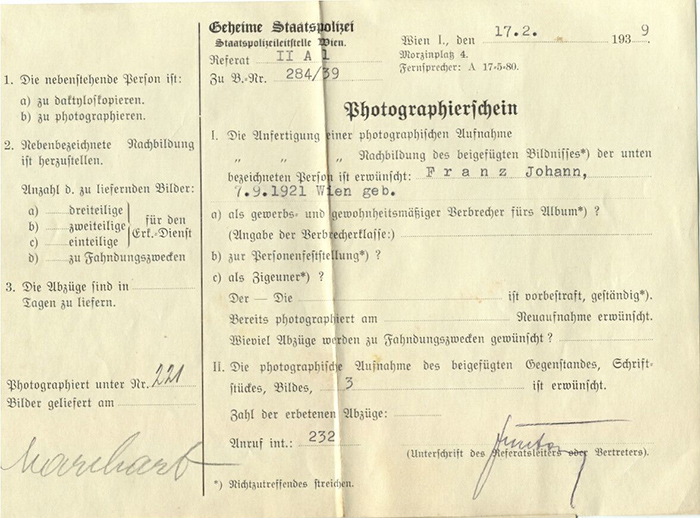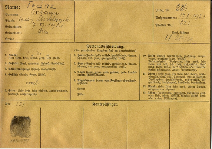 Der Tischlergehilfe Johann Franz gehörte einer Zelle des Kommunistischen Jugendverbands in Wien-Simmering an. Er wurde im Februar 1939 festgenommen und am 12. 3. 1940 vom Oberlandesgericht Wien zu 8 Monaten Gefängnis verurteilt.