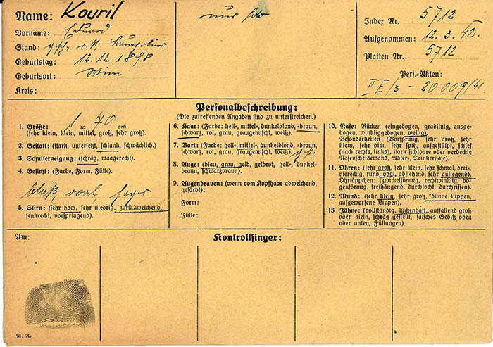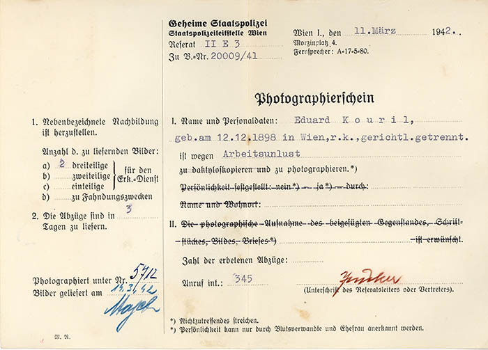 Wegen "Arbeitsunlust" wurde der Baupolier Eduard Kouril am 11. 3. 1942 von der Gestapo Wien erkennungsdienstlich erfasst. Er wurde am 11. 5. 1942 in das KZ Flossenbürg eingewiesen. Ab 17. 11. 1943 war er im KZ Mauthausen in Haft und kam dort am 13. 1. 1944 um.