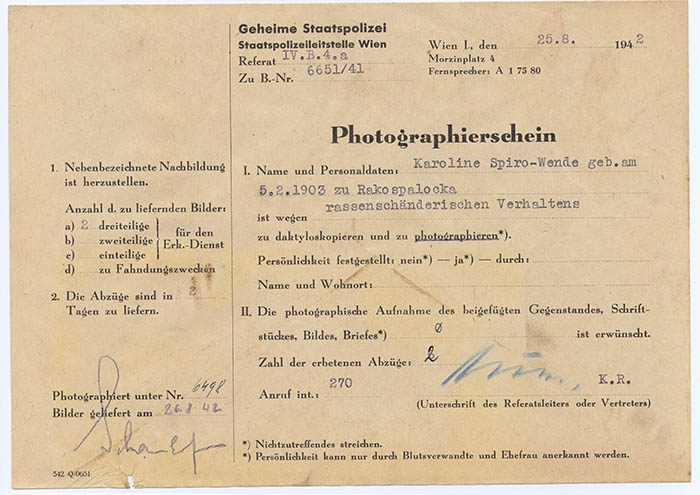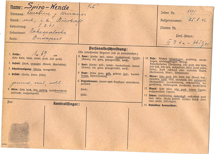 Die Bürokraft Karoline Spiro-Wende heiratete 1939 in Frankreich ihren jüdischen Lebensgefährten. Sie wurde am 25. 8. 1942 wegen "rassenschänderischen Verhaltens" festgenommen. Nach Einstellung des gegen sie eingeleiteten Strafverfahrens wurde ihre Überstellung in ein KZ auf die Dauer von 3 Monaten verfügt. Karoline Spiro-Wende kam am 15. 3. 1943 in Auschwitz um.