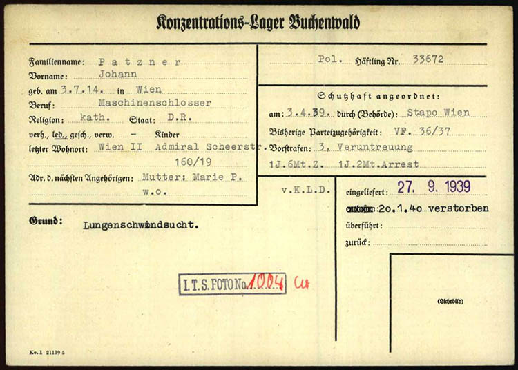 Der Maschinschlosser Johann Patzner war ab 3. 4. 1939 in Schutzhaft und wurde am 10. 6. 1939 in das KZ Dachau eingewiesen. Ab 27. 9. 1939 war er im KZ Buchenwald in Haft, wo er am 20. 1. 1940 umkam.