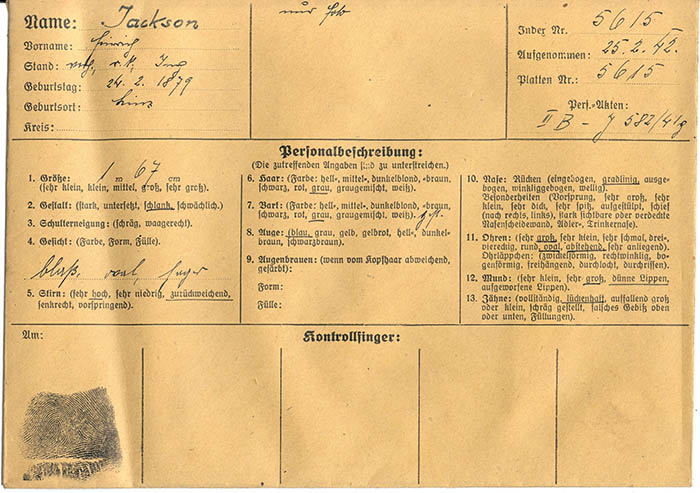 Der Ingenieur Heinrich Jackson (nach anderen Quellen geb. 24. 2. 1879) wurde im Februar 1942 zusammen mit seinem Sohn William Jackson (geb. 8. 11. 1921, Student), beide staatenlos, aus "staatspolizeilichen Gründen" festgenommen. Heinrich Jackson kam am 8. 9. 1942 im KZ Sachsenhausen um.