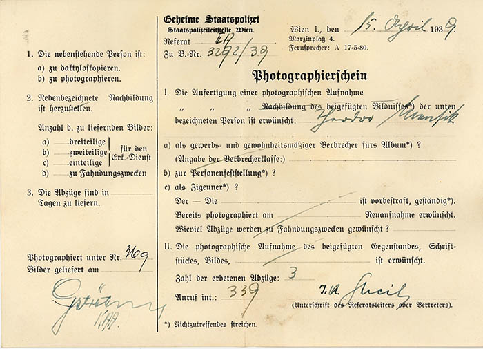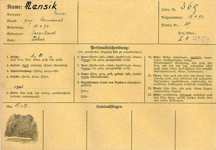 Der Landwirt Theodor Mensik aus dem "Protektorat Böhmen und Mähren" wurde am 15. 4. 1939 von der Gestapo Wien erkennungsdienstlich erfasst. Er kam am 7. 3. 1940 im KZ Sachsenhausen um.
