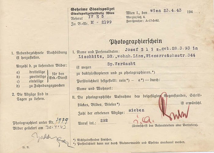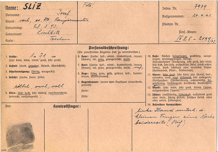 Der Rangiermeister Josef Sliz wurde am 23. 4. 1943 wegen "Spionageverdachts" von der Gestapo erkennungsdienstlich erfasst. Er gehörte einer Nachrichtenorganisation des polnischen Widerstands an, die Nachrichten aus dem gesamten Kriegsgebiet der deutschen Wehrmacht beschaffen und der polnischen Exilregierung in London übermitteln sollte, und wurde am 28. 2. 1945 vom Volksgerichtshof wegen "Landesverrats" und "Spionage" zum Tode verurteilt. Nach einem Fußmarsch von zum Tode verurteilten Häftlingen von Wien nach Stein a. d. Donau (NÖ) wurde Josef Sliz am 15. 4. 1945 mit 43 weiteren Verurteilten erschossen.