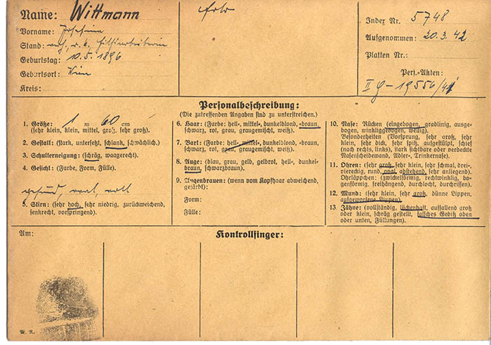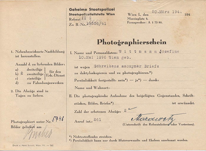 Die Hilfsarbeiterin Josefine Wittmann wurde am 20. 3. 1942 wegen "Schreibens anonymer Briefe" von der Gestapo erkennungsdienstlich erfasst.