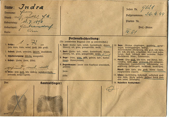 Der Hilfsarbeiter Franz Indra wurde am 26. 4. 1944 von der Gestapo Wien erkennungsdienstlich erfasst.