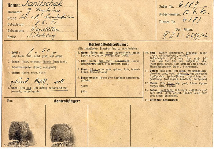 Die Landarbeiterin Magdalena Janitschek wurde im Juni 1942 wegen "verbotenen Umgangs" festgenommen. Sie kam am 10. 8. 1943 in Auschwitz um.