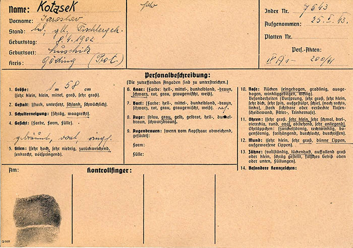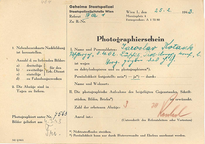Der Tischlergehilfe Jaroslav Kotasek wurde wegen "Vergehens nach dem Heimtückegesetz" am 25. 2. 1943 von der Gestapo Wien erkennungsdienstlich erfasst.