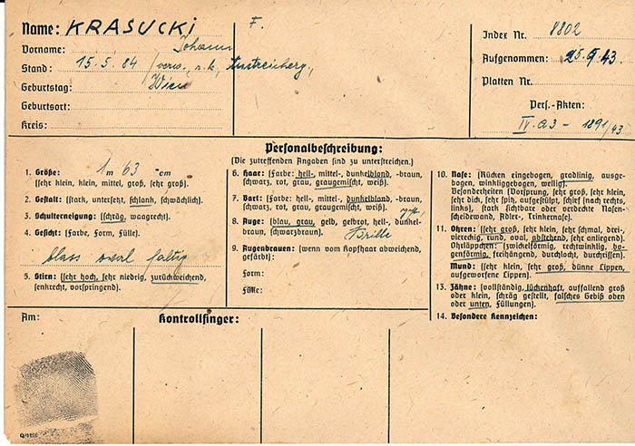 Wegen wiederholter "Führerbeleidigung" wurde der Anstreicher Johann Krasucky am 19. 9. 1940 festgenommen. Er wurde am 10. 2. 1942 neuerlich festgenommen, am 7. 10. 1942 wegen "Vergehens nach dem Heimtückegesetz" zu 9 Monaten Gefängnis verurteilt und verbüßte die Strafe bis 9. 7. 1943. Am 16. 2. 1944 wurde Johann Krasucki wieder wegen "Vergehens nach dem Heimtückegesetz" zu 1 Jahr 6 Monaten Gefängnis verurteilt. Er befand sich bis 7. 4. 1945 in Haft.