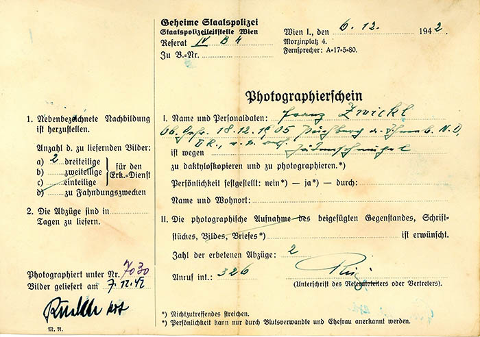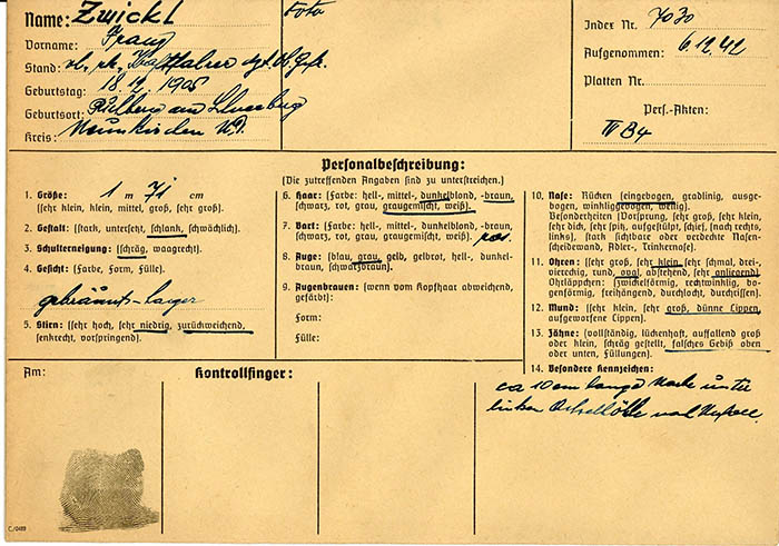 Franz Zwickl wurde am 6. 12. 1942 wegen "Judenschmuggels" festgenommen.