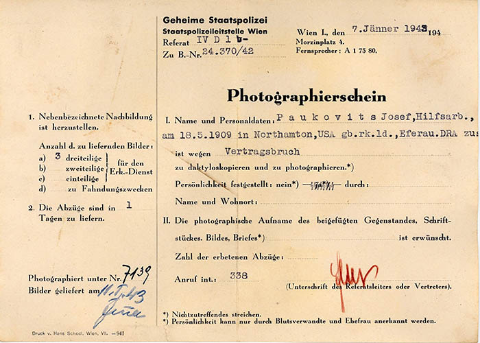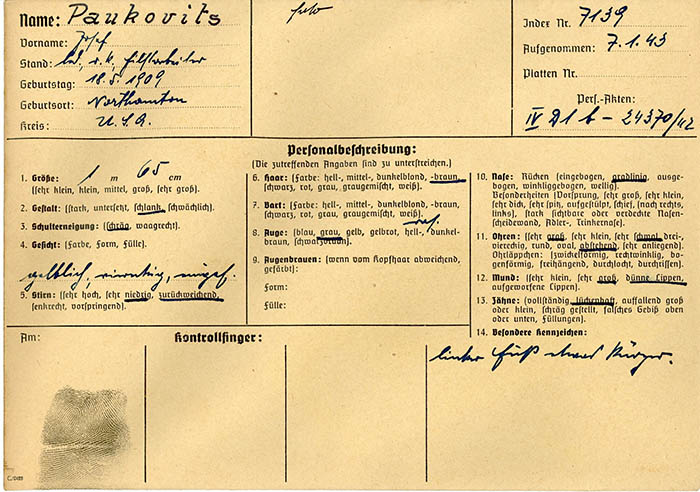 Der in den USA geborene Hilfsarbeiter Josef Paukovits wurde am 7. 1. 1943 wegen Arbeitsvertragsbruchs von der Gestapo Wien erkennungsdienstlich erfasst.