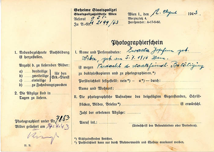 Die Lohnbuchhalterin Josefine Zwasta wurde am 10. 4. 1943 festgenommen und am 22. 2. 1945 vom Volksgerichtshof wegen "Vorbereitung zum Hochverrat", "Landesverrats" und "Kriegsspionage" zu 2 Jahren Zuchthaus verurteilt. Sie wurde am 5. 4. 1945 "wegen Kriegsnotstands" aus der Untersuchungshaftanstalt Wien II entlassen.