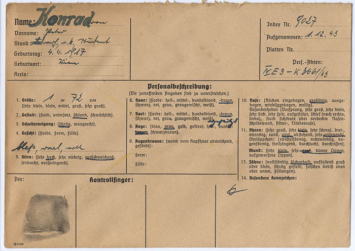 Der in Wien geborene Student Peter Konrad wurde am 5. 7. 1943 in Südfrankreich (Perpignan) wegen "staatsfeindlichen Verhaltens" festgenommen und in der Folge an die Gestapo Wien überstellt. Vom 30. 1. 1944 bis zur Befreiung Ende April 1945 war er im KZ Dachau in Haft.