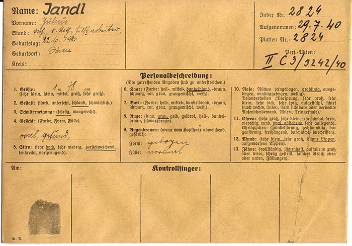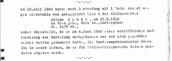 Anlässlich einer Aufforderung zur Musterung äußerte der Hilfsarbeiter Julius Jandl, "die Musterungskommission könne ihn in Arsch lecken, da er für Hilter-Kriegszwecke keinen Soldaten abgeben werde". Er wurde am 18. 7. 1940 an die Gestapo Wien überstellt und am 29. 7. 1940 erkennungsdienstlich erfasst.