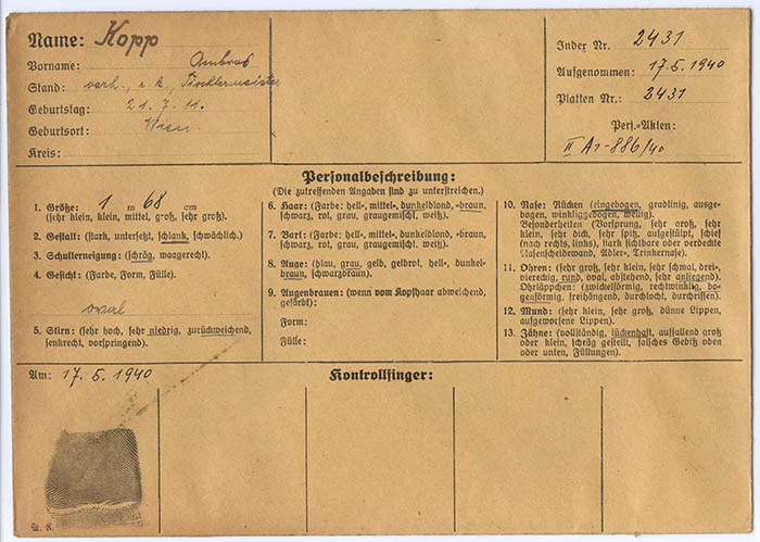 Der Tischlermeister Ambros Kopp wurde beschuldigt, "beunruhigende Nachrichten" an Mitarbeiter und Kunden verbreitet zu haben. Er wurde am 17. 5. 1940 festgenommen und am 14. 8. 1940 wegen "Vergehens nach dem Heimtückegesetz" zu 2 Jahren Gefängnis verurteilt. Nach Strafverbüßung wurde Kopp am 11. 7. 1942 in das KZ Dachau eingewiesen und von dort am 15. 6. 1943 in das KZ Flossenbürg überstellt. Am 1. 4. 1945 gelang ihm die Flucht aus dem Flossenbürger Außenlager Nürnberg (SS-Kaserne).