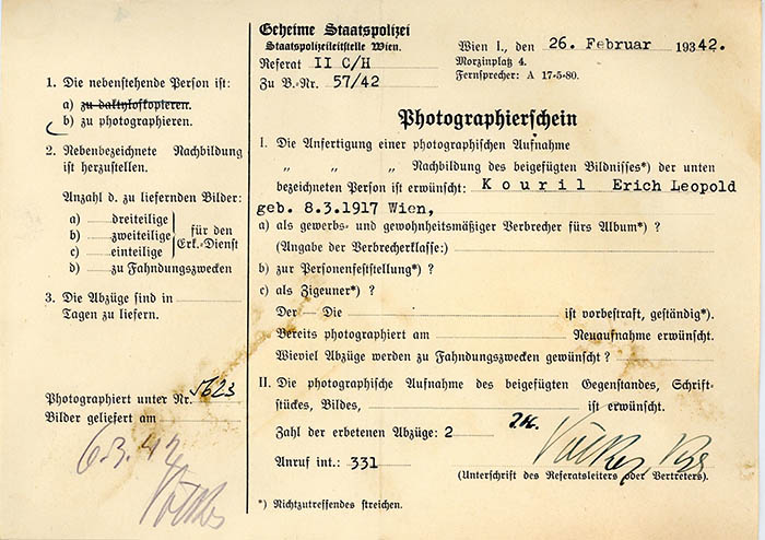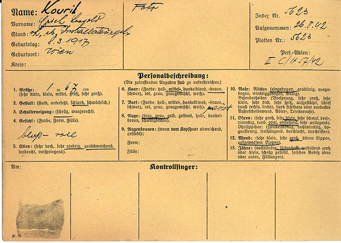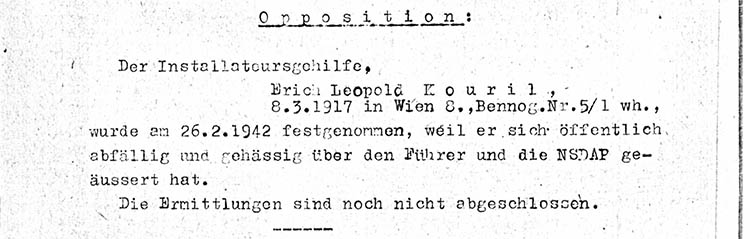 Wegen "Vergehens nach dem Heimtückegesetz" wurde der Installateurgehilfe Erich Leopold Kouril am 26. 2. 1942 festgenommen und am 1. 10. 1942 zu 1 Jahr 3 Monaten Gefängnis verurteilt.