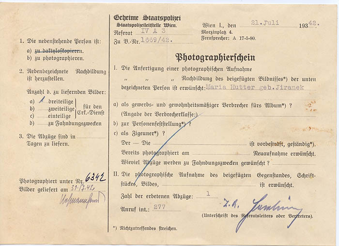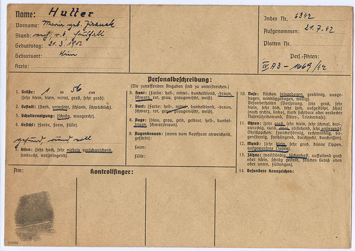 Maria Hutter wurde am 21. 7. 1942 wegen "abträglicher Äußerungen" festgenommen.