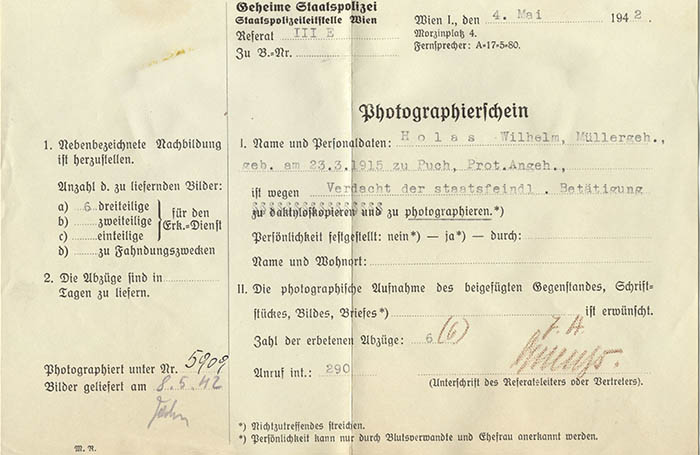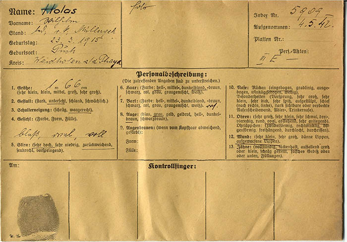 Der Müllergehilfe Wilhelm Holas wurde am 4. 5. 1942 wegen "Verdacht staatsfeindlicher Betätigung" von der Gestapo Wien erkennungsdienstlich erfasst.