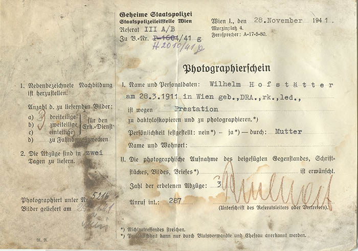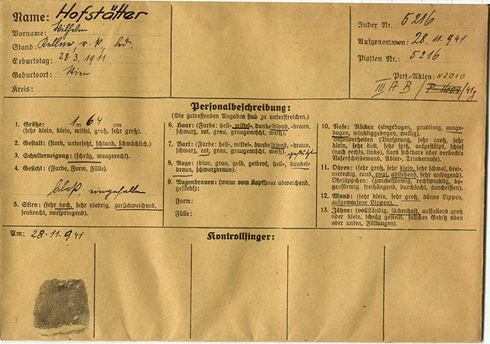 Der Kellner Wilhelm Hofstätter meldete sich in Frankreich zum unbewaffneten militärischen Arbeitsdienst (service de prestation). Er wurde am 28. 11. 1941 wegen "Prestation" von der Gestapo Wien erkennungsdienstlich erfasst.