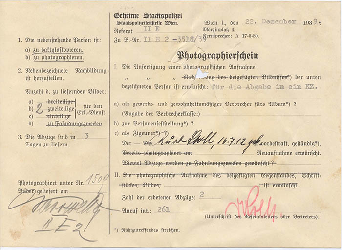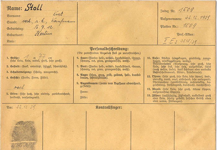 Der Kaufmann Kurt Stoll wurde am 22. 12. 1939 mit dem Vermerk "für die Abgabe in ein KZ" von der Gestapo Wien erkennungsdienstlich erfasst. Ihm wurden "Preistreiberei" und "volksschädigendes Verhalten" vorgeworfen.