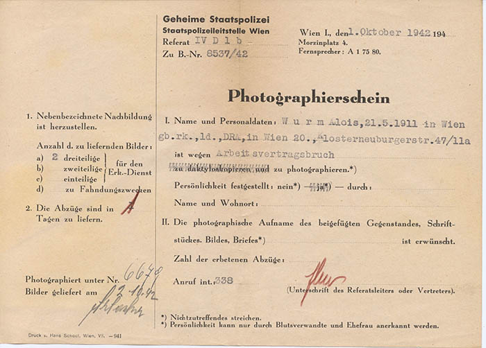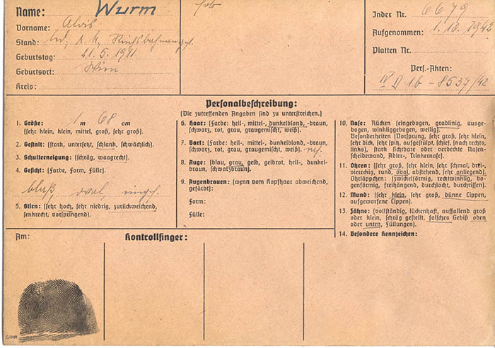 Der Reichsbahnangestellte Alois Wurm wurde wegen "Arbeitsvertragsbruchs" am 1. 10. 1942 von der Gestapo Wien erkennungsdienstlich erfasst.