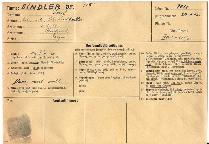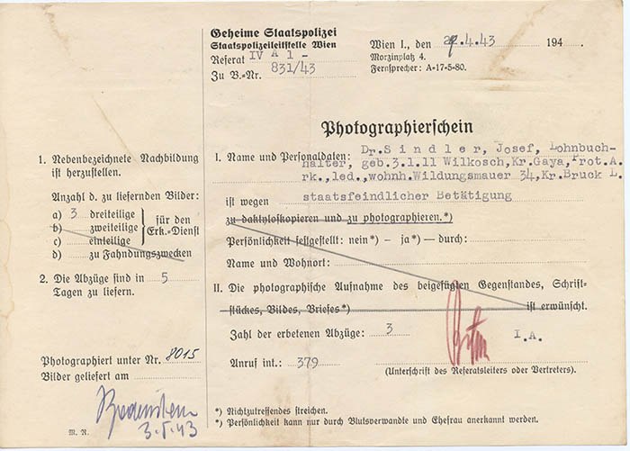Der tschechische Lohnbuchhalter Josef Sindler wurde am 8. 4. 1943 festgenommen und am 29. 4. 1943 wegen "staatsfeindlicher Betätigung" von der Gestapo Wien erkennungsdienstlich erfasst. Nach Haft in Auschwitz wurde er am 2. 4. 1944 in das KZ Buchenwald eingewiesen und von dort am 29. 10. 1944 in das KZ Mittelbau (Dora) überstellt.