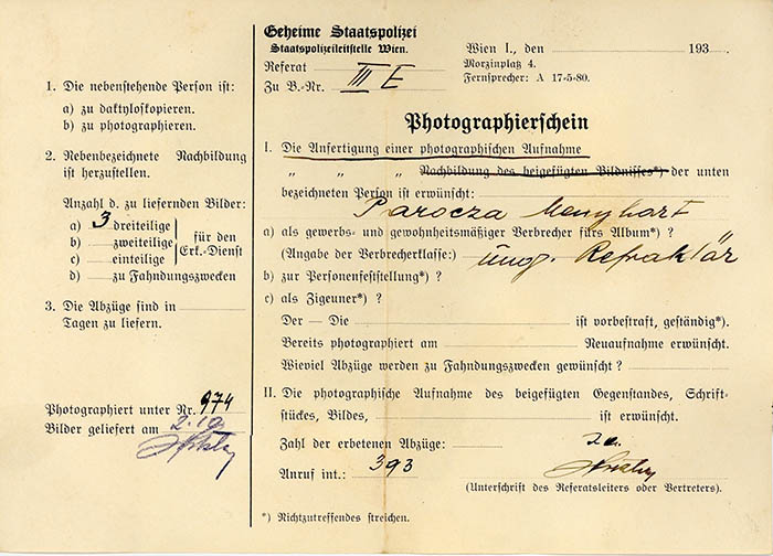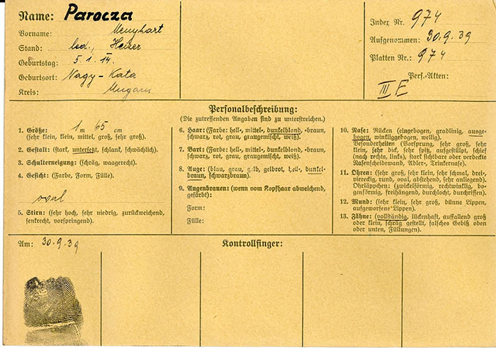 Menyhart Parocza wurde als "ungarischer Refraktär" (Wehrdienstverweigerer) am 30. 9. 1939 von der Gestapo Wien erkennungsdienstlich erfasst.