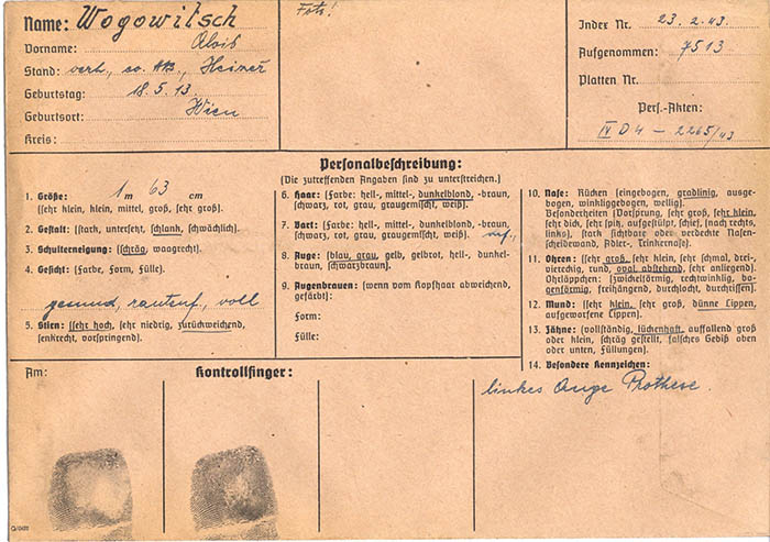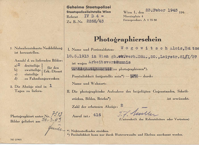 Wegen "Arbeitsversäumnis" wurde der Heizer Alois Wogowitsch am 23. 2. 1943 von der Gestapo Wien erkennungsdienstlich erfasst.