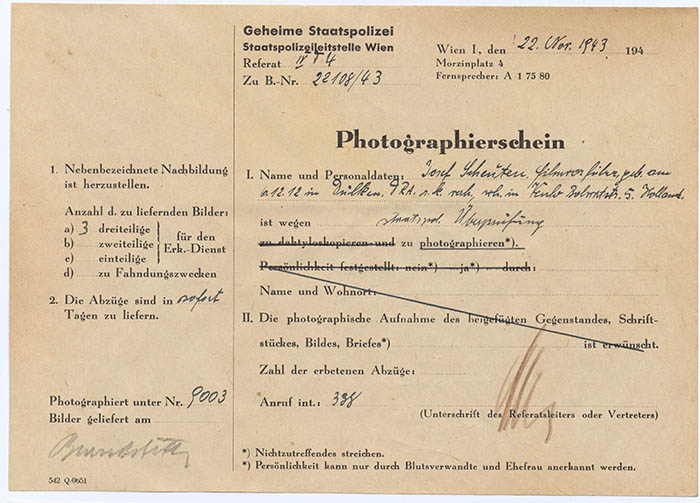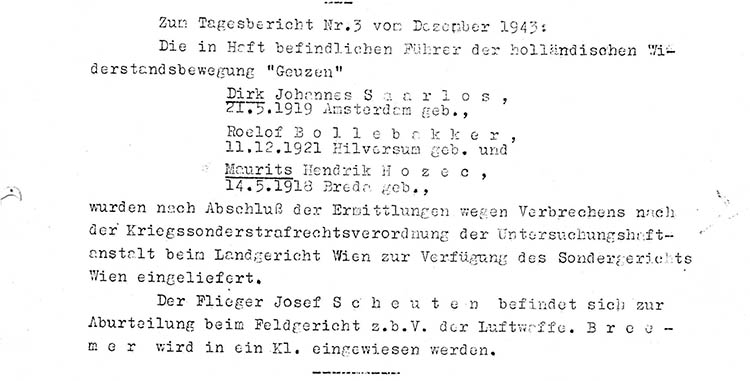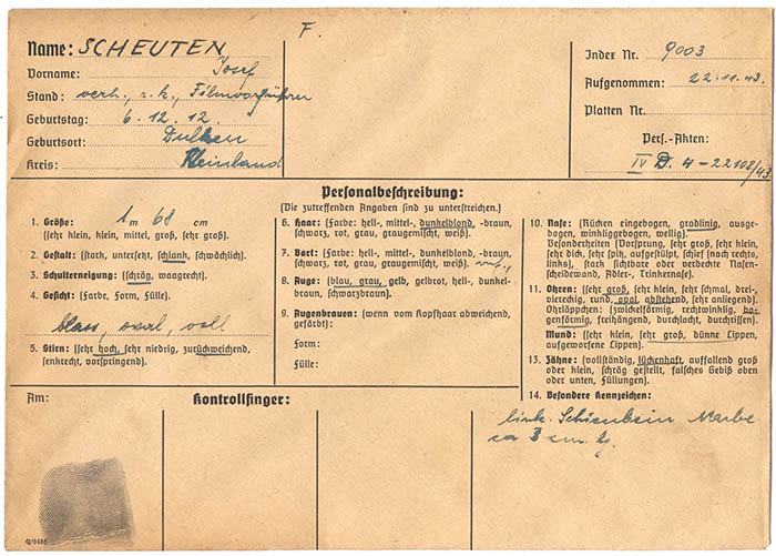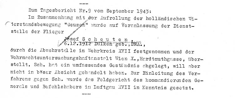 Im Zusammenhang mit der holländischen Widerstandsbewegung "Geuzen" wurde der Flieger Josef Scheuten festgenommen und am 22. 11. 1943 von der Gestapo Wien erkennungsdienstlich erfasst.