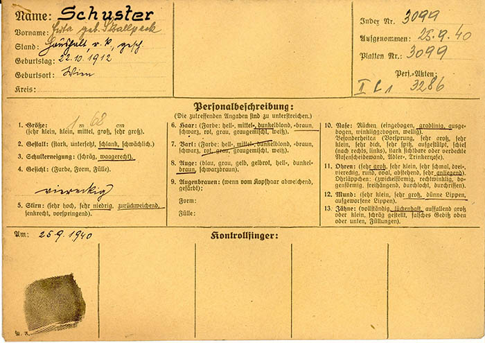 Herta Schuster wurde am 18. 9. 1940 wegen "wehrkraftzersetzender" Äußerungen und "Verdachts der Bestechung eines Beamten eines Wehrbezirkskommandos" festgenommen.