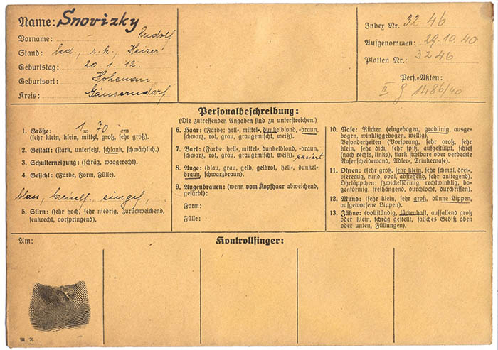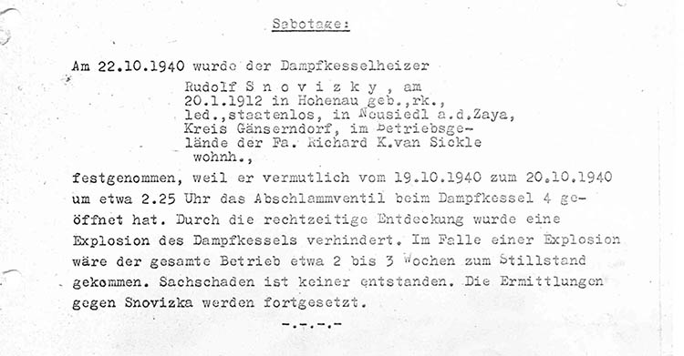 Der Heizer Rudolf Snovizky wurde wegen Verdachts der Sabotage am 22. 10. 1940 festgenommen und am 29. 10. 1940 von der Gestapo Wien erkennungsdienstlich erfasst.