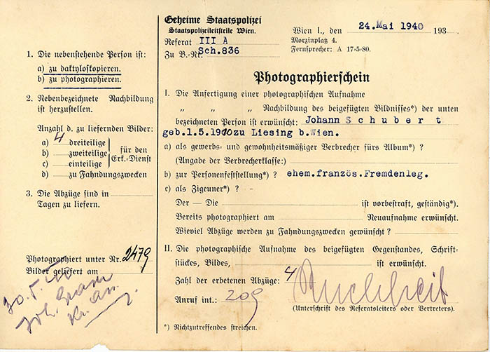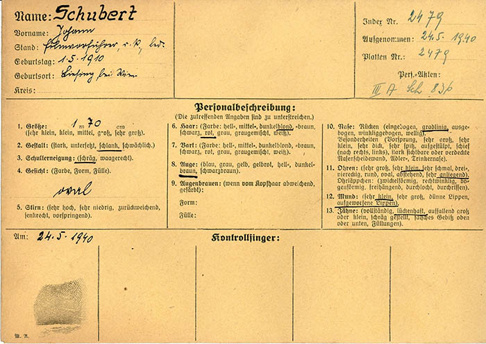 Der Filmvorführer Johann Schubert wurde am 24. 5. 1940 als "ehemaliger französischer Fremdenlegionär" von der Gestapo Wien erkennungsdienstlich erfasst.