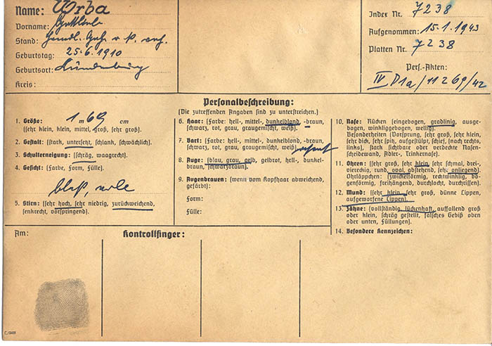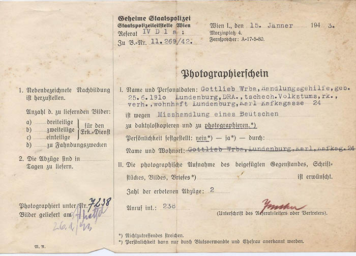 Der tschechische Handelsgehilfe Gottlieb Wrba wurde wegen "Misshandlung eines Deutschen" am 15. 1. 1943 von der Gestapo Wien erkennungsdienstlich erfasst.