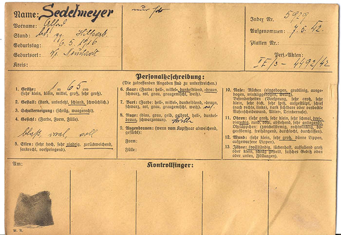 Wegen "Arbeitsflucht" wurde der Hilfsarbeiter Alfred Sedelmeyer am 7. 5. 1942 von der Gestapo Wien erkennungsdienstlich erfasst.