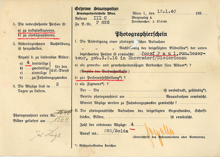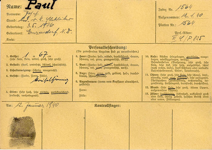 Josef Paul wurde am 12. 1. 1940 als "rumänischer Deserteur" von der Gestapo Wien erkennungsdienstlich erfasst.