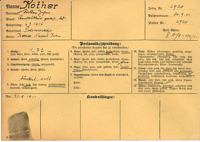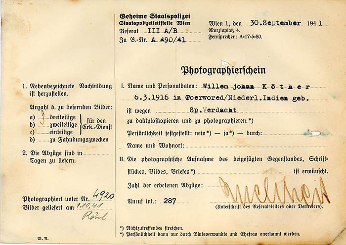 Der in Poerwaredjo (Suriname) geborene Konstrukteur Willem Johan Köther wurde am 30. 9. 1941 wegen "Spionageverdachts" von der Gestapo Wien erkennungsdienstlich erfasst.