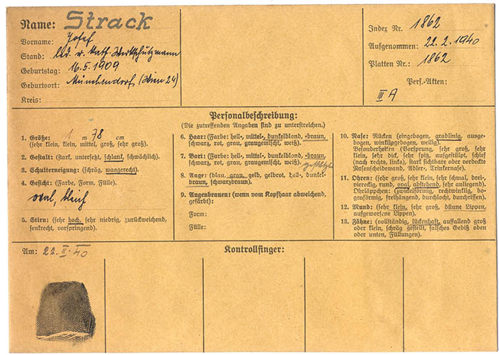 Der Werkschutzmann Josef Strack wurde am 22. 2. 1940 als "ehemaliger französischer Fremdenlegionär" von der Gestapo Wien erkennungsdienstlich erfasst.