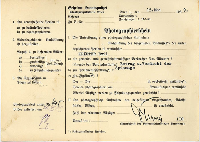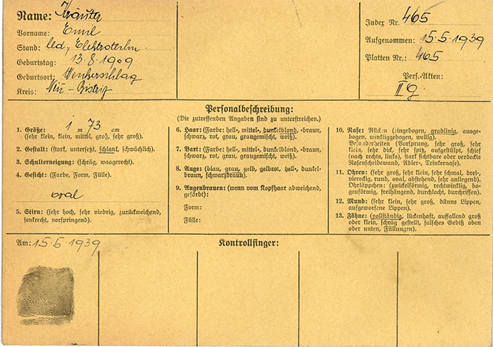 Der Elektrotechniker Emil Kräuter wurde am 17. 11. 1938 festgenommen und am 15. 5. 1939 wegen "Betrugs und Verdachts der Spionage" von der Gestapo Wien erkennungsdienstlich erfasst. Er wurde am 22. 9. 1939 in das KZ Buchenwald eingewiesen und von dort am 3. 9. 1941 in das Landgerichtsgefängnis Znaim (Znojmo) überstellt. Ab 16. 5. 1942 war er im KZ Dachau in Haft. Dort erlebte Kräuter die Befreiung am 29. 4. 1945.