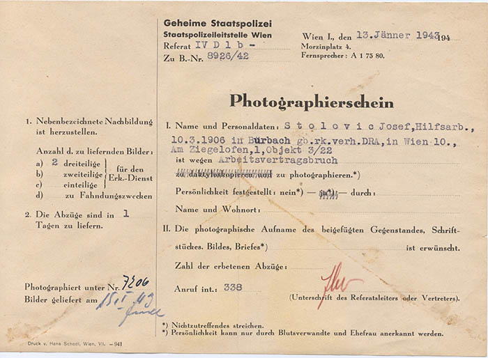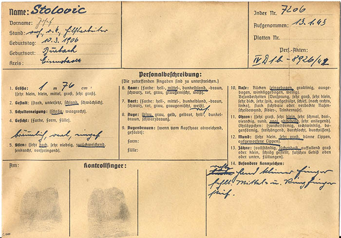 Der Hilfsarbeiter Josef Stolovic wurde am 13. 1. 1943 wegen "Arbeitsvertragsbruchs" von der Gestapo Wien erkennungsdienstlich erfasst.