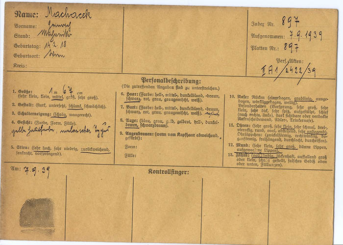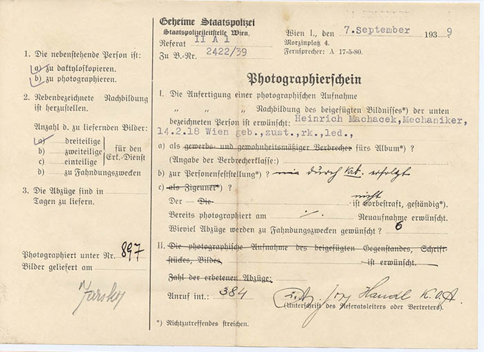 Der Mechaniker Heinrich Machacek wurde am 1. 9. 1939 wegen "Vergehens nach dem Heimtückegesetz" festgenommen und am 18. 4. 1940 zu 7 Monaten Gefängnis verurteilt; die Strafe war durch die Untersuchungshaft verbüßt. Am 13. 6. 1944 wurde Machacek, zu dieser Zeit in Gerstl (Gde. Sonntagberg, NÖ) wohnhaft, neuerlich verhaftet, nun wegen "verbotenen Umgangs" (mit "deutschblütigen" Mädchen) und "Gerüchtemacherei". Er blieb bis April 1945 in Haft.