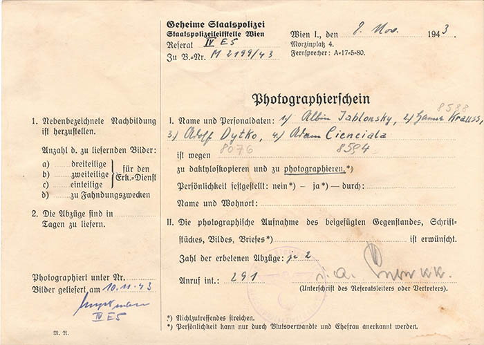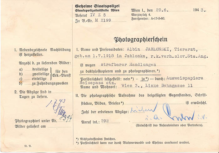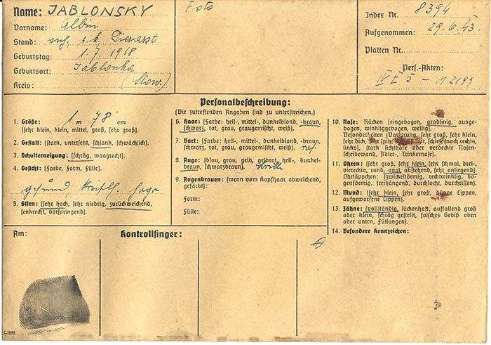 Dem Tierarzt Albin Jablonsky (Jablonski), einem slowakischen Staatsangehörigen, wurde vorgeworfen, für den Nachrichtendienst "Stragan" der polnischen Widerstandsbewegung "Armia Krajowa" (Heimatfront) zu arbeiten. Er wurde am 29. 6. 1943 festgenommen und am 22. 9. 1944 in das KZ Dachau eingewiesen. Dort erlebte er Ende April 1945 die Befreiung.