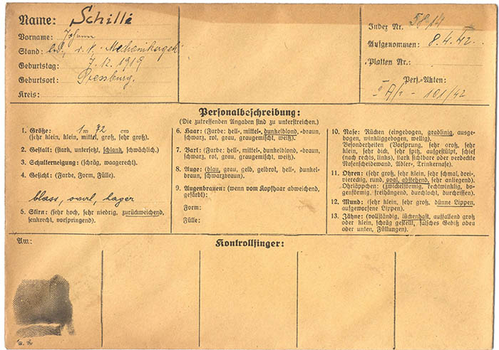 Der Mechaniker Johann Schille (Schilli) wurde wegen "Abhörens feindlicher Rundfunksendungen" am 8. 4. 1942 von der Gestapo Wien erkennungsdienstlich erfasst.