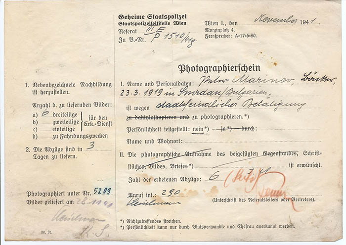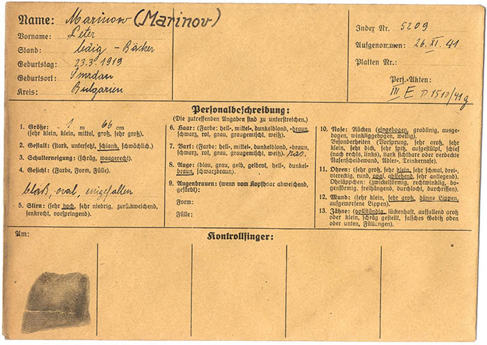 Der Bäcker Peter Marinov wurde am 26. 11. 1941 wegen "staatsfeindlicher Betätigung" von der Gestapo Wien erkennungsdienstlich erfasst.