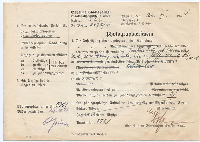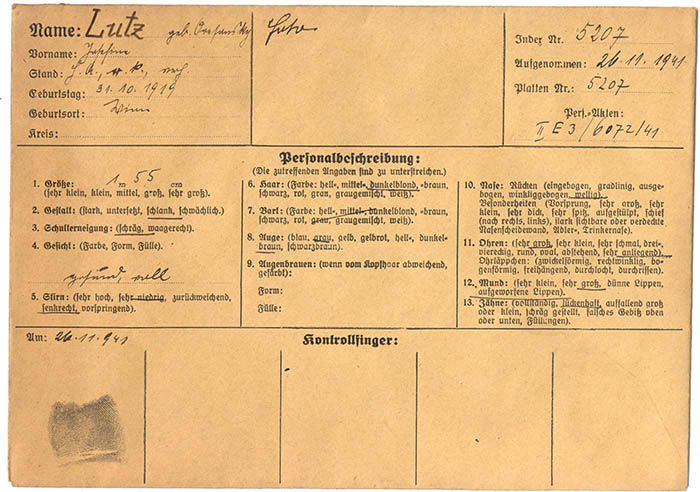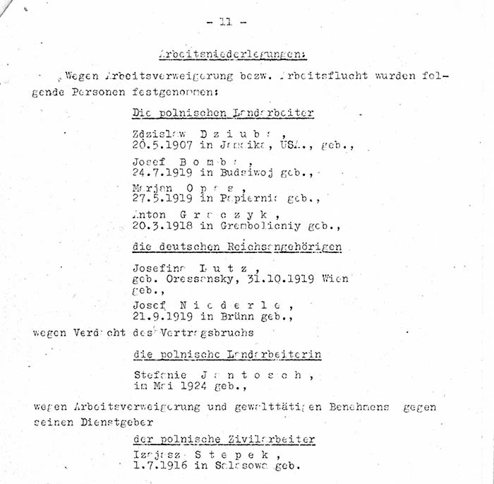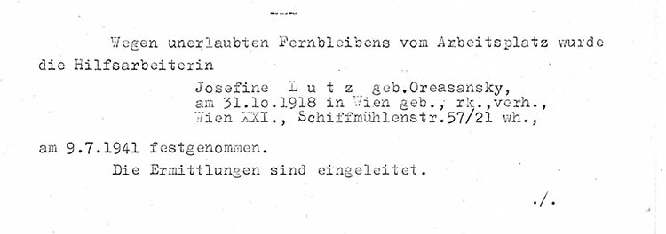 Die Hilfsarbeiterin Josefine Lutz wurde am 9. 7. 1941 wegen "unerlaubten Fernbleibens vom Arbeitsplatz" und neuerlich im November 1941 wegen "Arbeitsverweigerung bzw. Arbeitsflucht" festgenommen.