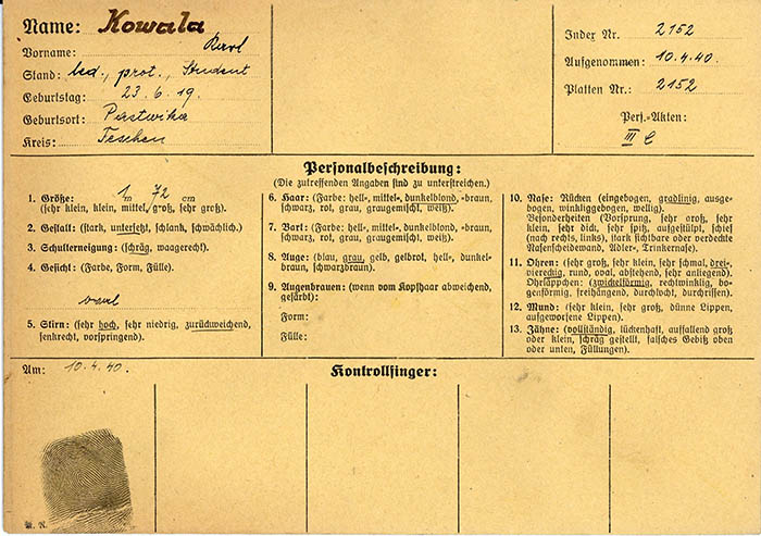 Der polnische Student Karl Kowala wurde am 23. 3. 1940 festgenommen und am 10. 4. 1940 von der Gestapo Wien erkennungsdienstlich erfasst. Am 10. 12. 1942 wurde er in das KZ Mauthausen eingewiesen und von dort am 11. 12. 1942 in das Außenkommando Gusen überstellt.