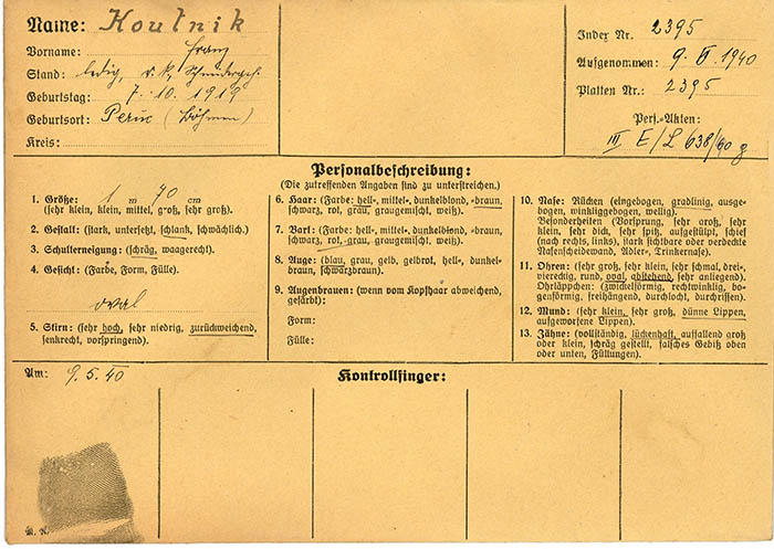 Der Schneidergehilfe Franz (Frantisek) Koutnik wurde am 9. 5. 1940 von der Gestapo Wien erkennungsdienstlich erfasst. Wegen "Vorbereitung zum Hochverrat" zu 3 Jahren Zuchthaus verurteilt, wurde er nach Strafverbüßung in das KZ Auschwitz überstellt. Von dort wurde er im August 1943 in das KZ Buchenwald, später in das KZ Mittelbau (Dora) verlegt.