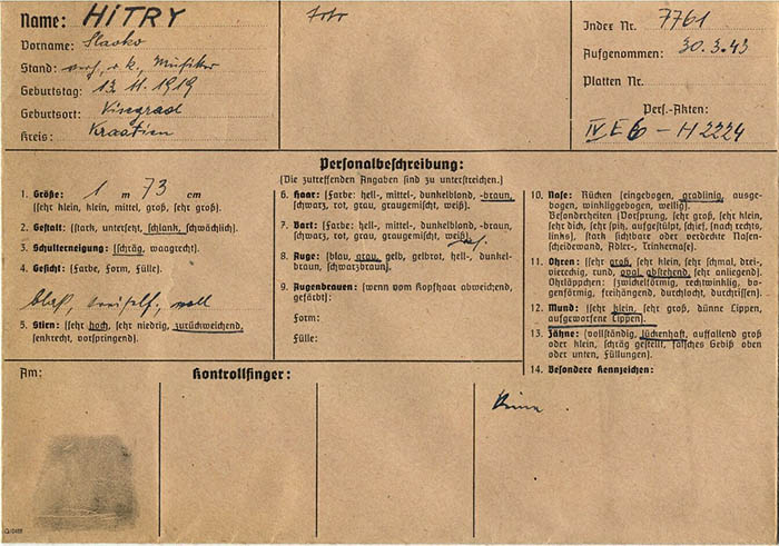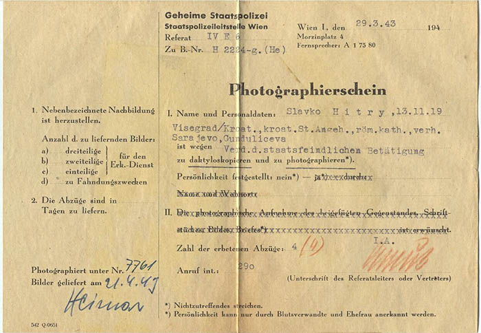 Der kroatische Musiker Slavko Hitry wurde wegen "Verdachts der staatsfeindlichen Betätigung" am 29. 3. 1943 von der Gestapo Wien erkennungsdienstlich erfasst.