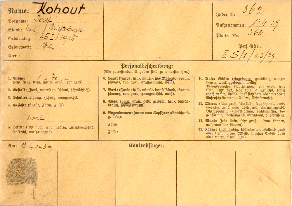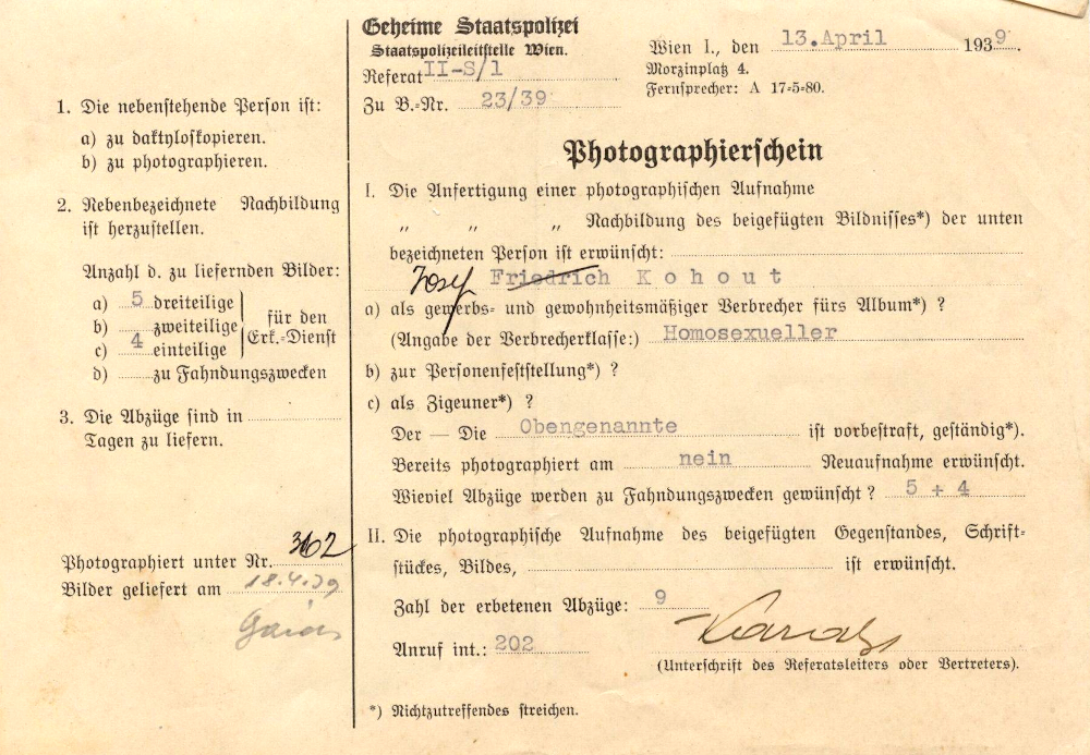Der Postvertragsangestellte Josef Kohout wurde am 13. April 1939 "wegen homosexueller Betätigung" festenommen.