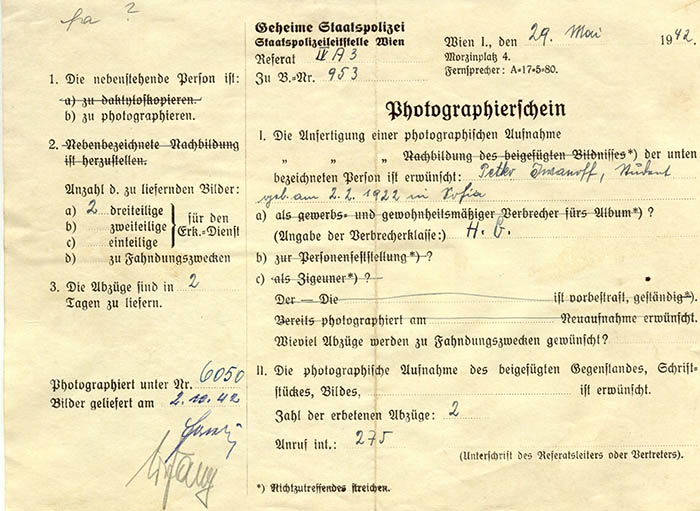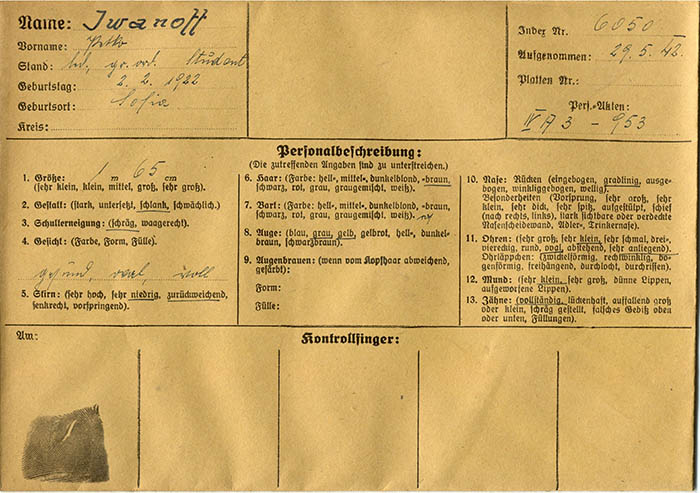 Der bulgarische Student Petko Iwanoff wurde am 29. 5. 1942 wegen "Vergehens nach dem Heimtückegesetz" von der Gestapo Wien erkennungsdienstlich erfasst.
